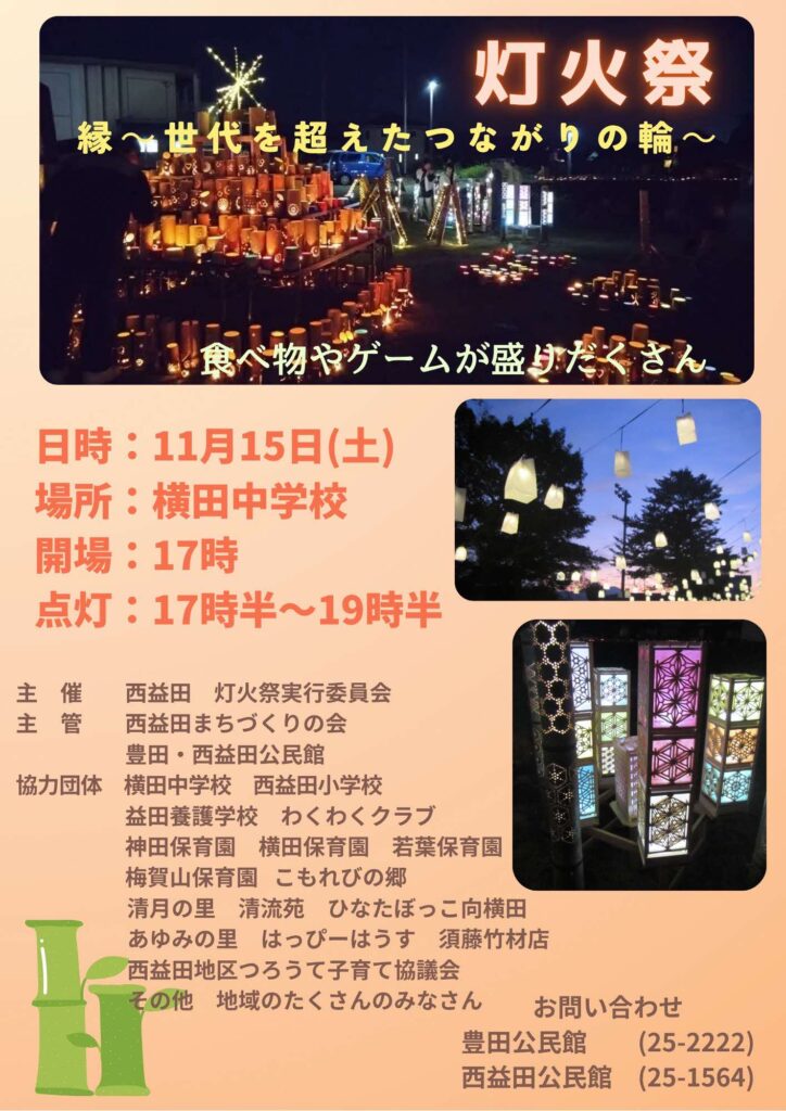 今週末には、ご協力いただいた西益田で「灯火祭」が開催されます。竹灯籠や鞠灯篭、スタンプラリー、ゲームなどもあるそうです。西益田出身の益高生も多数参加予定ですので、ぜひ遊びに行ってみてください。