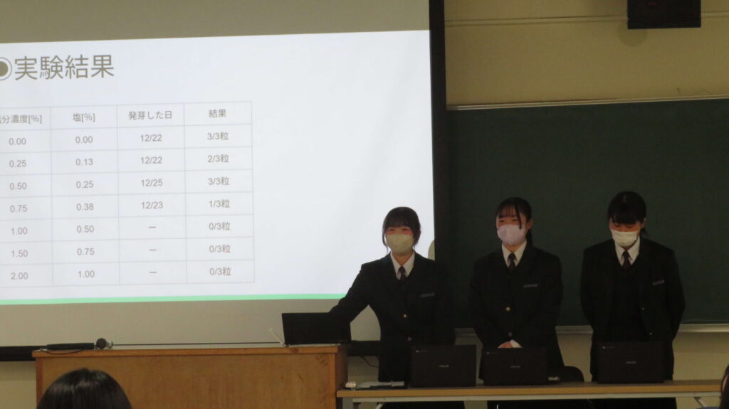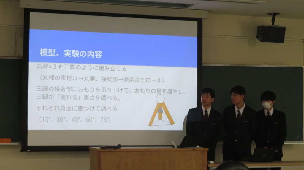 3月17日(火)に1年生理数科が山口大学を訪問しました。今年度行った課題研究について大学の先生方に向けて発表を行い、指導助言をいただきました。これまで7月のオンライン講義、12月の訪問実習を通して研究のテーマや方法を学び、8テーマに分かれて研究を行ってきました。実験を繰り返し、多くのデータを集めたグループもあれば実験が思うように進まず悔しい思いをしたグループもあったようですが、発表に対して大学の先生方からたくさんご助言をいただいて、どのグループも2年生での課題研究に向けて意欲が増した様子でした。