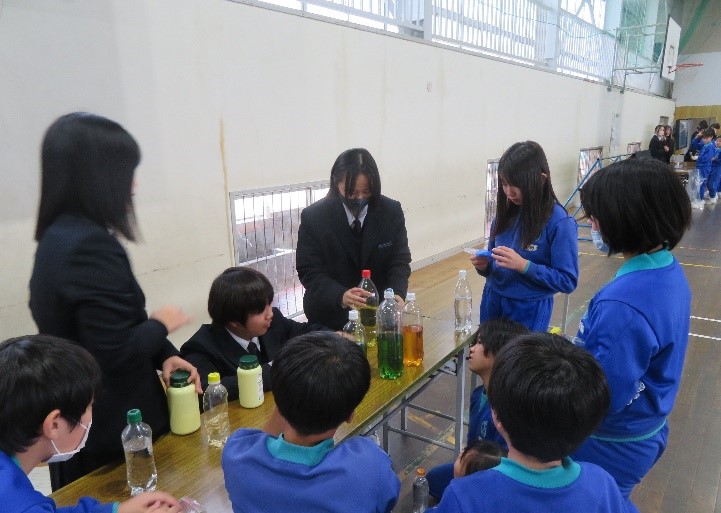 当日は、小学生が目を輝かせながら実験に取り組む姿や、不思議そうに現象を観察する様子が見られました。特に、水素爆発の実験では「わぁ!」という大きな歓声が上がり、理科の面白さを実感してもらえたように感じました。また、生徒たちにとっても、相手に分かりやすく説明することの難しさを学ぶ貴重な経験となりました。