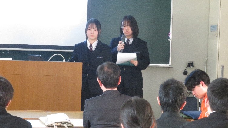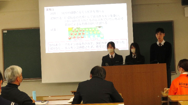 3月23日(日)に山口大学吉田キャンパスで開催された「ジュニアリサーチセッション(中高生研究発表会)」に、2年理数科が参加しました。理数科は1年時から山口大学連携実習で訪問しており、今回が訪問3回目となります。午前は総合発表を聴講し、午後の分野別分科会の一般発表では予備審査で選ばれた「紙で調べる構造の耐久性について」、「防音するダンボールの中芯の形状に関する研究」、「SDSと細菌と食紅の退色の関係性について」、「益田川の脱窒素細菌の活性化条件」の4つのゼミが発表しました。審査の結果、「SDSと細菌と食紅の退色の関係性について」が第3会場の最優秀賞を獲得しました。2年生の堂々とした発表や質問に答える姿が見られ、成長を感じました。今回の発表会で学んだことを活かして、6月の課題研究発表会に向けて研究を進めていきます。