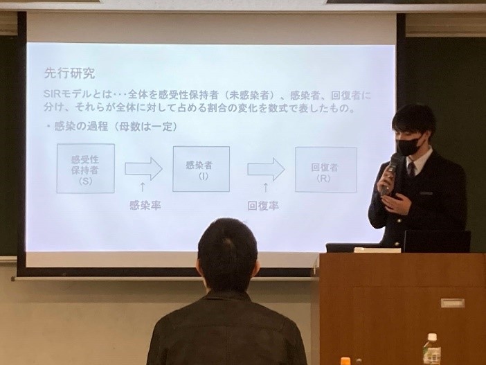 3月20日(水)山口大学で行われた、ジュニアリサーチセッションに2年理数科の5ゼミが発表してきました。2年生理数科の生徒は、1年生の時から山口大学を訪問しているので、今回で3回目となります。午前中は総合発表を聴講し、午後は一般発表で各分野の分科会が開催され、数学ゼミ「SIRモデルを用いた感染者数の推移」、物理ゼミ「風車のブレードの違いによる発電効率の変化」「ドミノの倒れ方についての研究」、生活科学ゼミ「卵白の代替品を探そう!」、生物ゼミ「イシドジョウの好む空隙の条件」の発表を行いました。その結果、第3会場で発表を行った「イシドジョウの好む空隙の条件」が優秀賞を獲得しました。今年度最後の外部発表でしたが、堂々と発表している姿や質問をする姿を見ることができ、成長を感じることができました。来年度、6月に予定されている課題研究発表会に向け、研究を継続していきます。