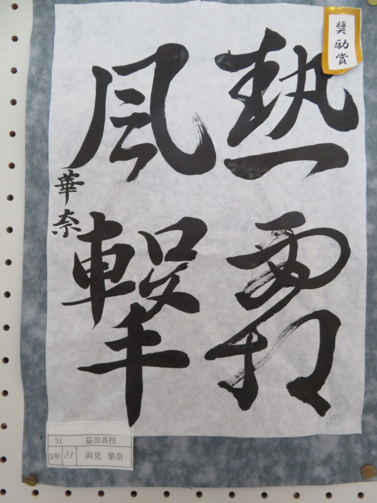 1,2年生の書道選択者と書道部で益田市児童・生徒書初展に応募しました。その結果、2年生の部では岩井龍一さんが市長賞、近原希歩さんが議長賞、両見華奈さんが奨励賞をいただきました。1年生の部では河野愛子さんが議長賞、青木遥香さんが教育長賞、田原悠佑さんが奨励賞をいただきました。 その他の作品も生徒昇降口に展示してありますので、ぜひご覧ください。 facebookでシェアする twitterでつぶやく LINEで送る PREV BACK TO ALL NEXT