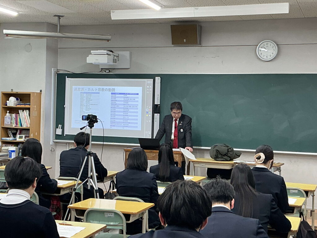 いよいよ成人として巣立っていく3年生に向け、社会で実際に起こっている様々なトラブルについてご説明いただきました。お金のトラブルだけでなく、宗教勧誘や詐欺商法、SNSを使った詐欺事件など、実際の事件を事例に挙げて紹介いただき、ネット上の情報だけでなく、信頼できる情報媒体に常に触れることの大切さと、正しく情報を判断することの難しさを実感する時間になりました。