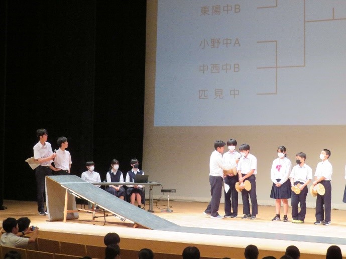 競技では、的に作品を載せることに多くのチームが苦戦をしていましたが、時折、的の上にある作品をはじき飛ばす場面も見受けられ、熱い戦いが繰り広げられました。結果は下記をご覧ください。