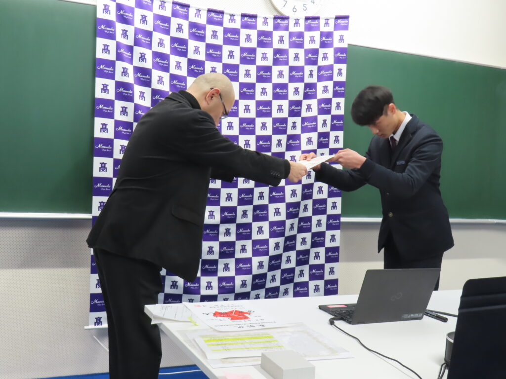 12月23日(火)に表彰式、終業式を行いました。授業、大掃除のあと生徒たちはそれぞれの教室で配信の形で臨みました。校長講話の時間には2年生の小笠原さん、河野さんが参加し「子どもの権利条約」に基づいて生徒の意見を表明する機会としました。