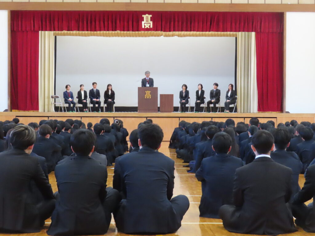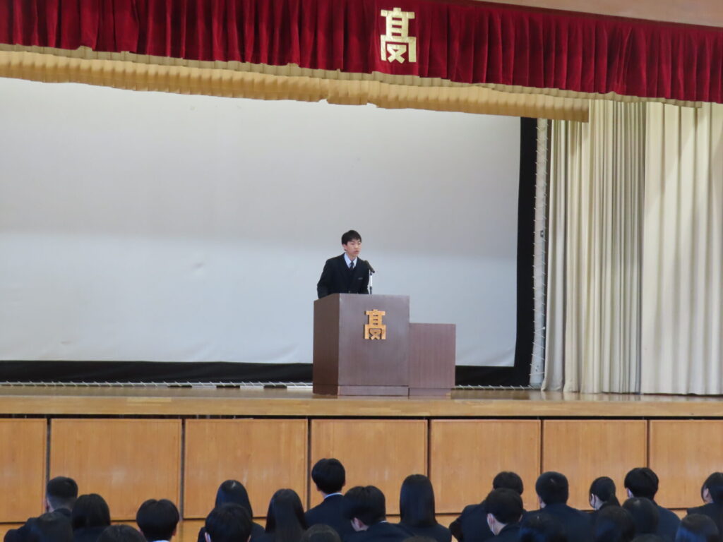 終業式の前に表彰式、2年河野さんの英語スピーチ発表、2年長藤さんの弁論発表がありました。
