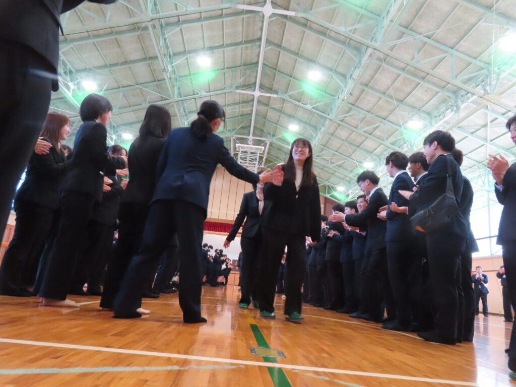 その後、転任式を行い9名の教員よりあいさつがありました。多くの卒業生が参加してくれ、花道をつくって先生方をお見送りしました。